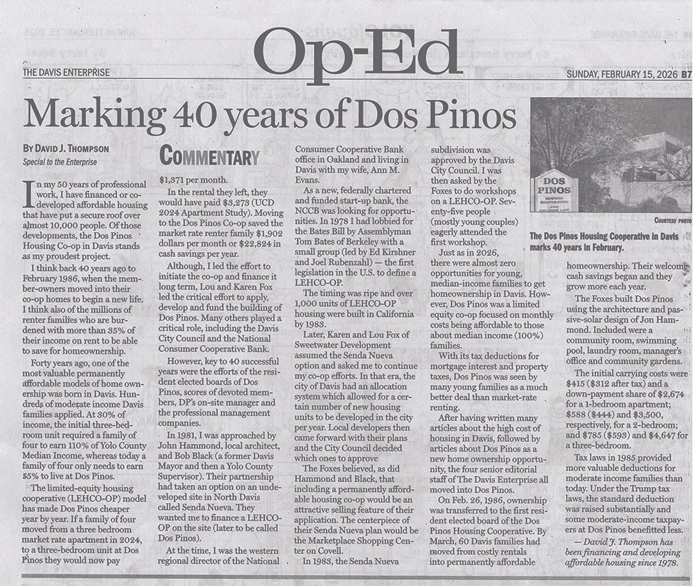 Indigo Principal Architect Jon Hammond’s name in print in David Thompson’s op ed in the Davis Enterprise. Thompson’s account outlines the process by which a visionary team including an architect (Hammond), developers, and a co-op banker (Thompson himself) were able to get high-quality, energy-efficient, low cost housing built in north Davis’ Senda Nueva neighborhood in the 1980s. The housing cooperative model used at Dos Pinos has kept the townhouse apartments in this complex affordable and has encouraged the flourishing of a close-knit community of residents.